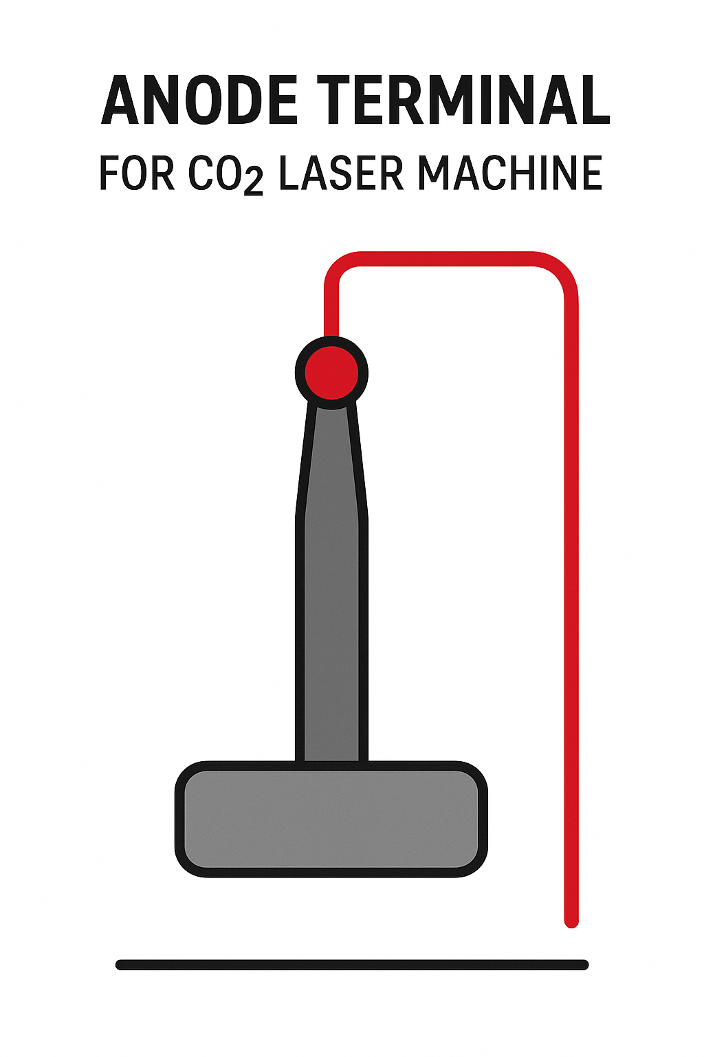 The anode terminal supplies high-voltage electricity to excite the gases inside the CO₂ laser tube, which generates the laser beam.