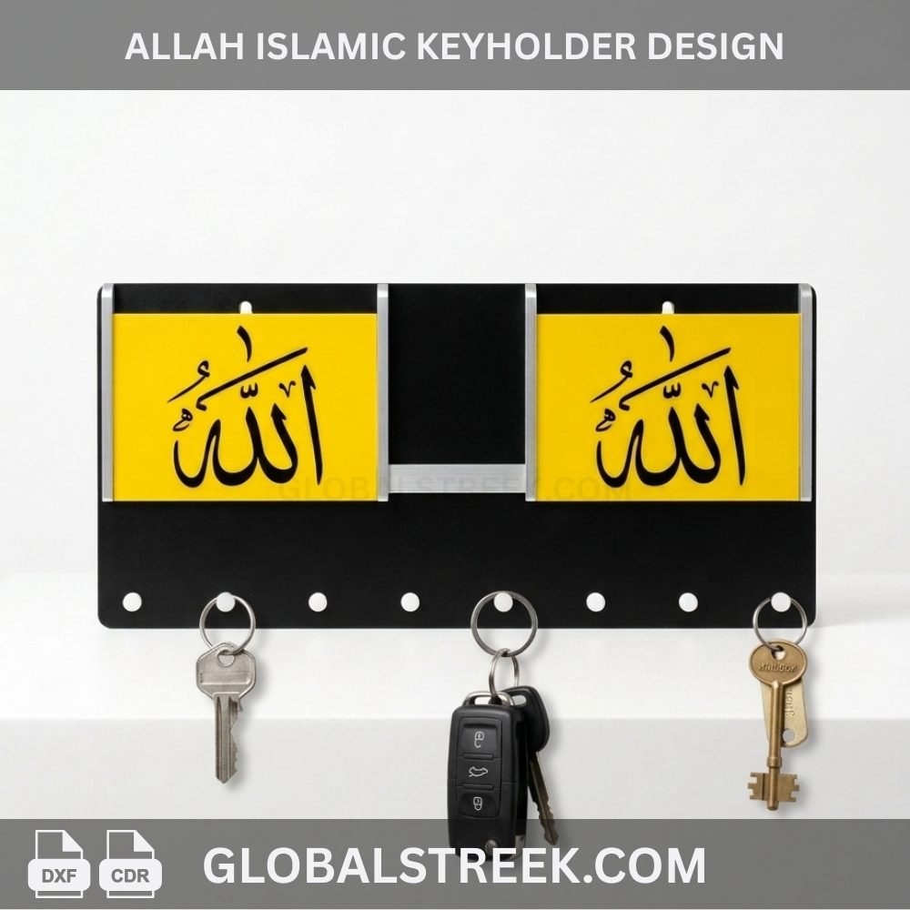 The Allah Islamic Keyholder Design is a high-quality digital DXF file made for CNC and laser cutting machines. This design combines spiritual Islamic art with practical use, helping you create a beautiful wall-mounted keyholder for your home.