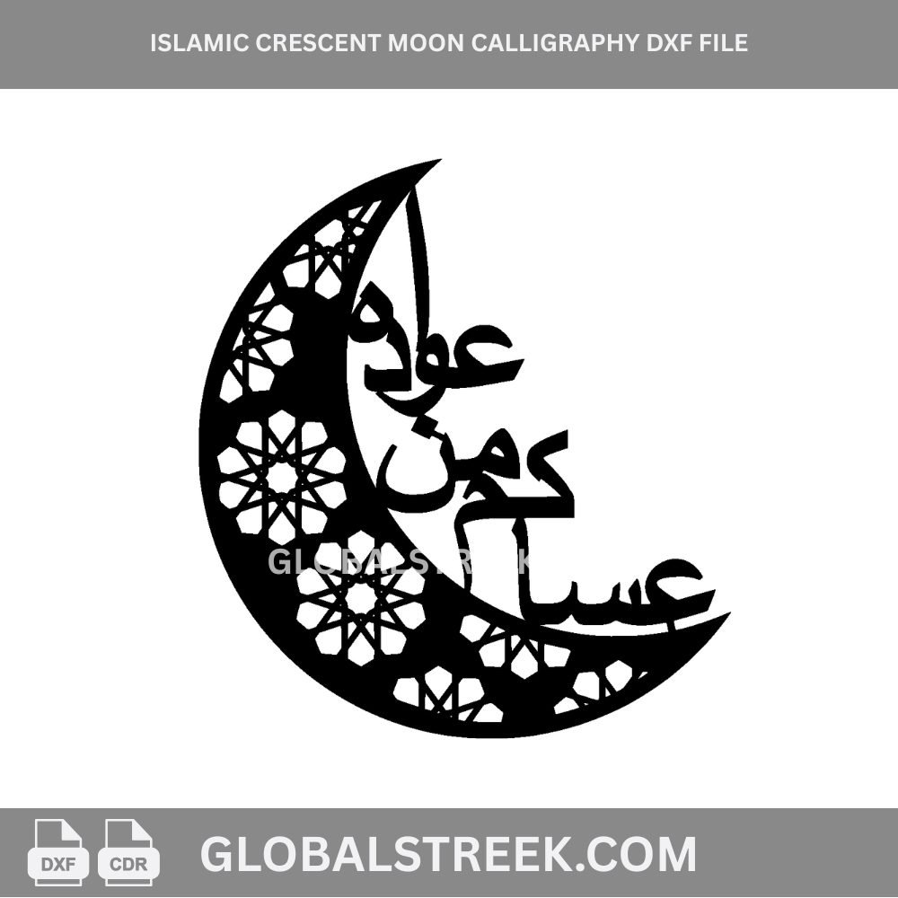 Download this Crescent Moon DXF file designed for laser cutting and CNC projects. This Islamic design features a large crescent moon shape combined with Arabic calligraphy and detailed geometric patterns. The overall composition creates a visually appealing and meaningful decor piece suitable for festive and daily use.