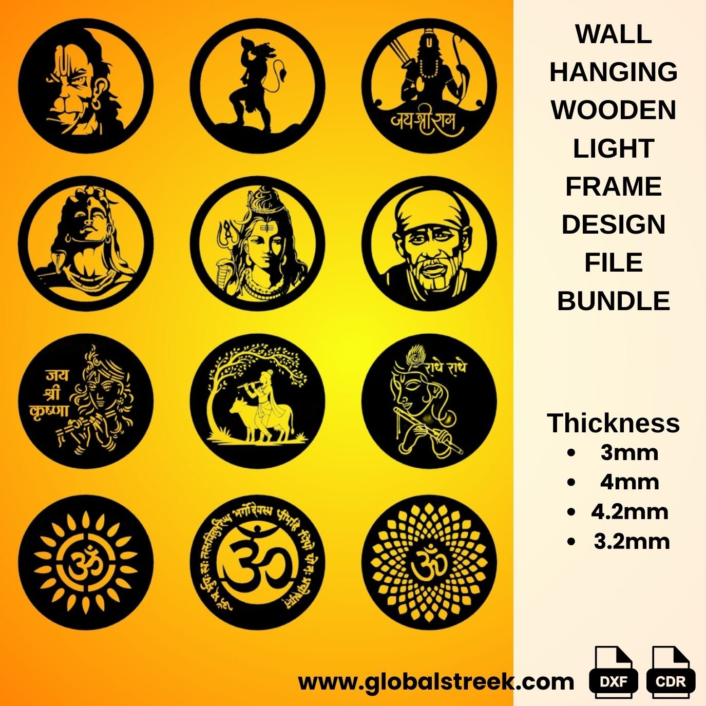 This bundle includes 60+ premium wooden wall hanging lamp designs inspired by Indian spiritual and religious themes such as Hanuman, Shri Ram, Ganpati, Shiva, Om Symbol, Swastik, Khatu Shyam, Jain symbols, and Shree Swami Samarth. Each design reflects devotion, elegance, and craftsmanship, making them perfect for LED wall décor and gifting.