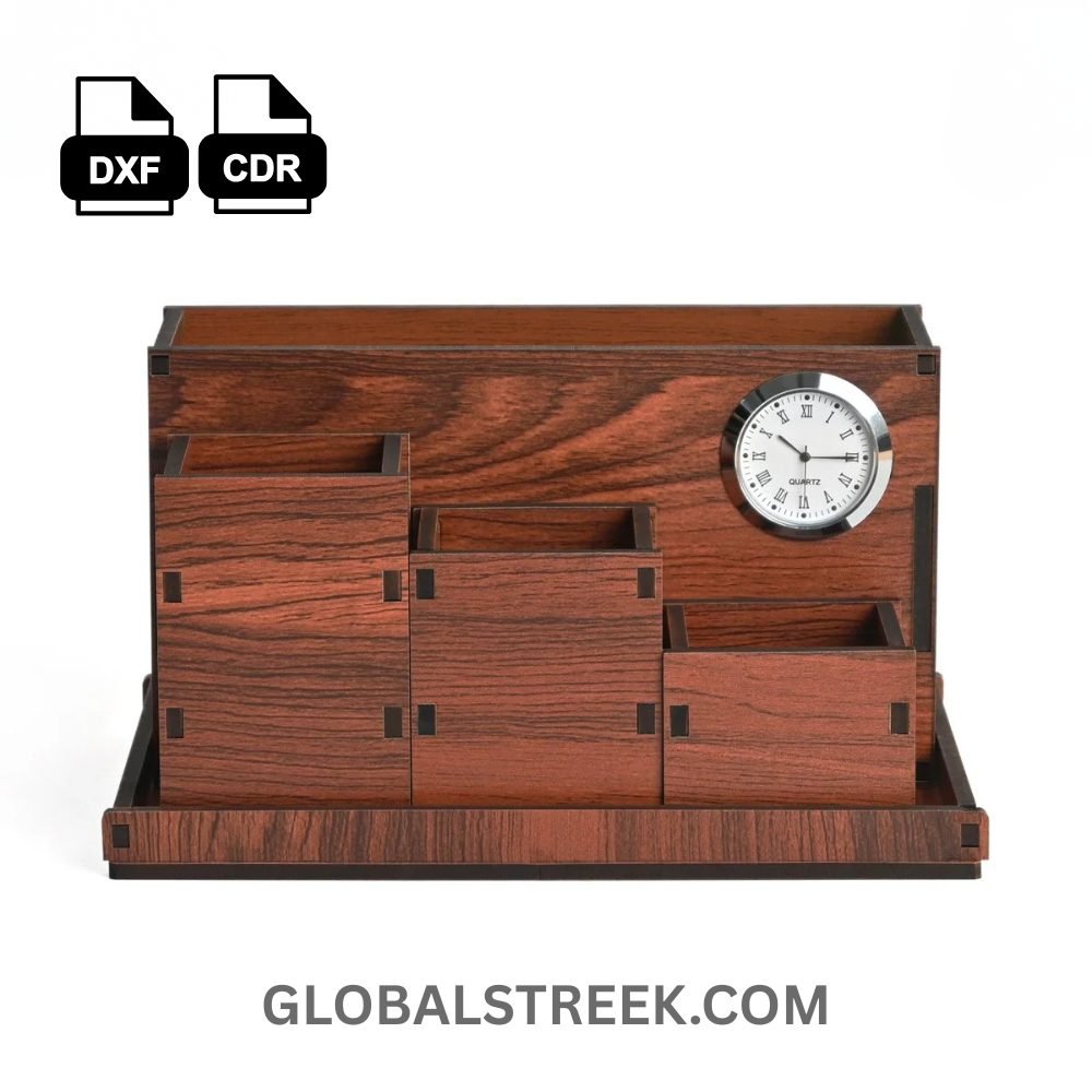 The Wooden Desk Organizer with Clock Laser Cutting File is a professionally designed digital file created for laser cutting users, CNC makers, and craft businesses. This elegant office desk organizer design with an integrated clock helps you create a functional and stylish desk accessory using 4.2mm MDF, plywood, or wood sheets. It improves desk organization while adding a premium look to any workspace.